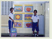 Livros de Literatura e pirulito.Os alunos foram convincentes e criativos no